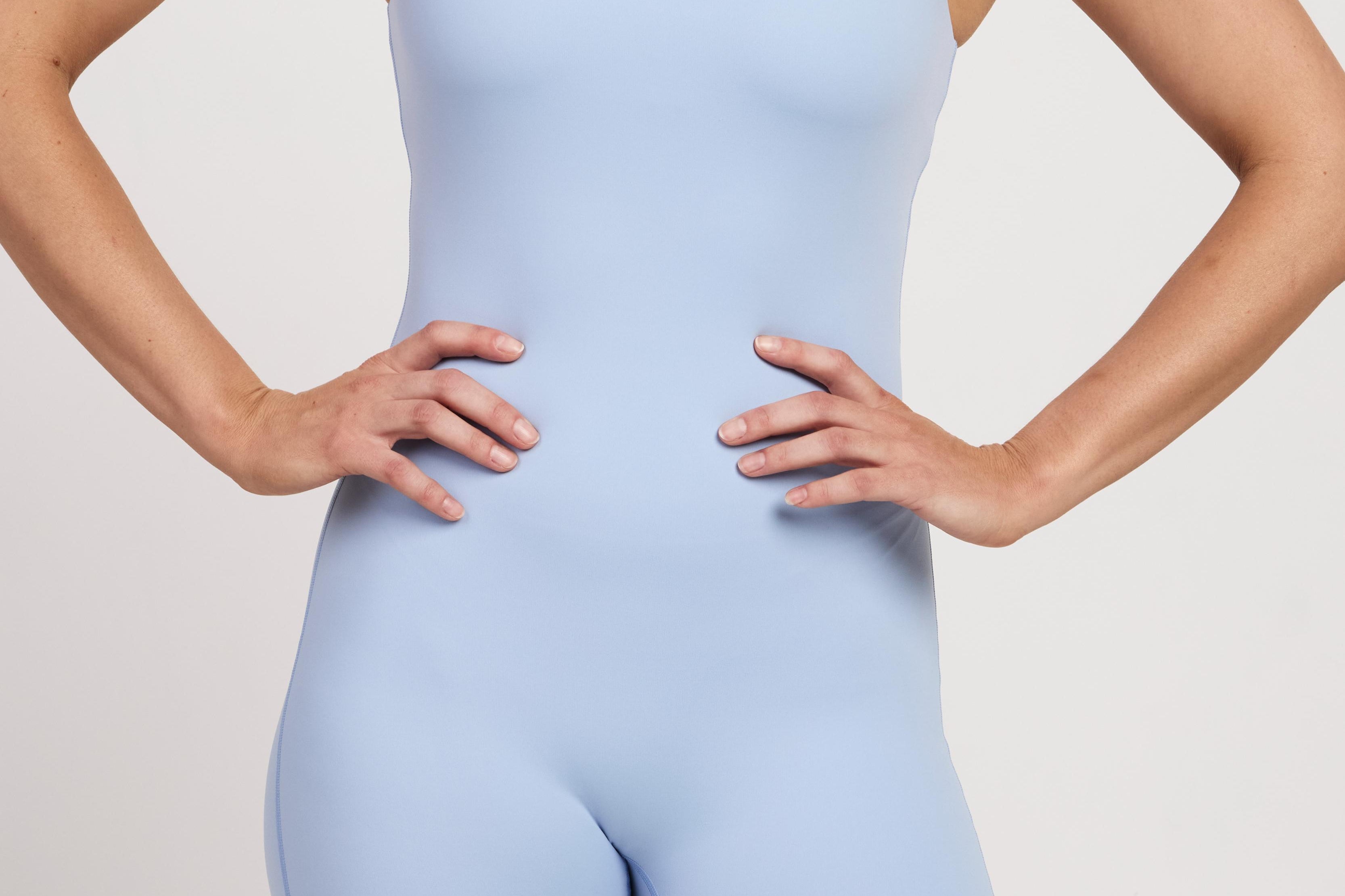 Sleeveless bodysuit with just above mid leg length. This bodysuit features a rounded neck square line